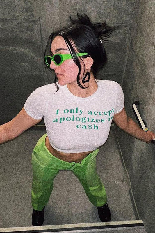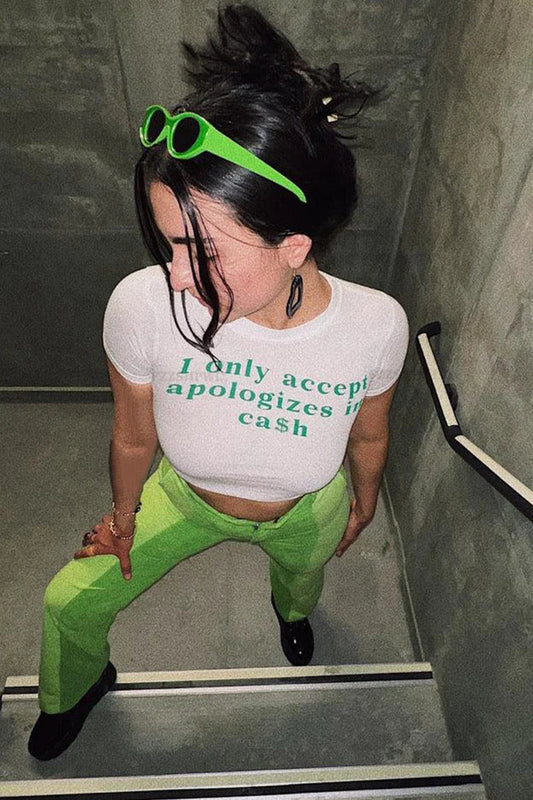 Dripping with sarcasm and street-style edge, this white baby tee says what we’re all thinking. Designed for baddies with boundaries, the “I Only Accept Apologies in Cash” crop top is your go-to for calling out red flags in style. It’s bold, it’s funny, and it’s trending.